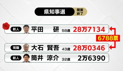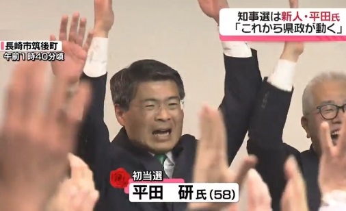 長崎県知事選に立候補していたのは、現職(一期)の大石賢吾氏のほか、元副知事の平田研氏、共産党長崎県委員会常任委員の筒井涼介氏で、結果は大石氏との接戦を制した平田研氏が初当選を決めた。
